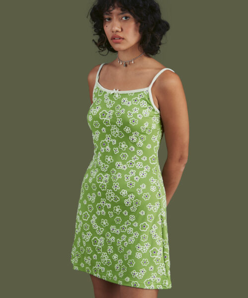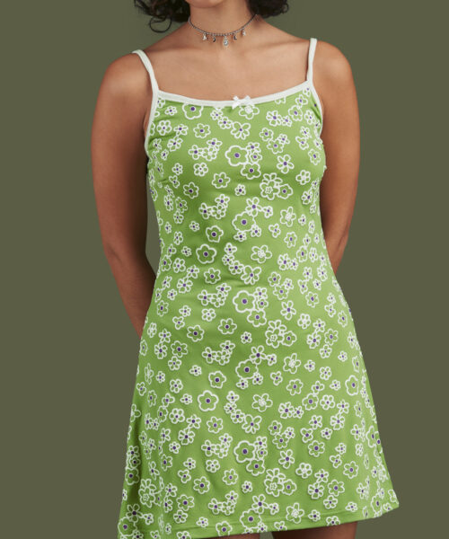 Stretchy floral dress with puff print detailing and velvet neckline, binding and straps.