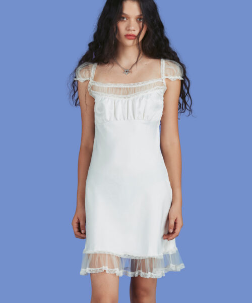 Gorgeous satin crinkle dress with tulle accent details at the shoulders, bust and bottom hem. Truly angelic.