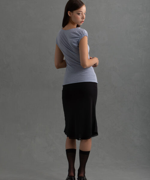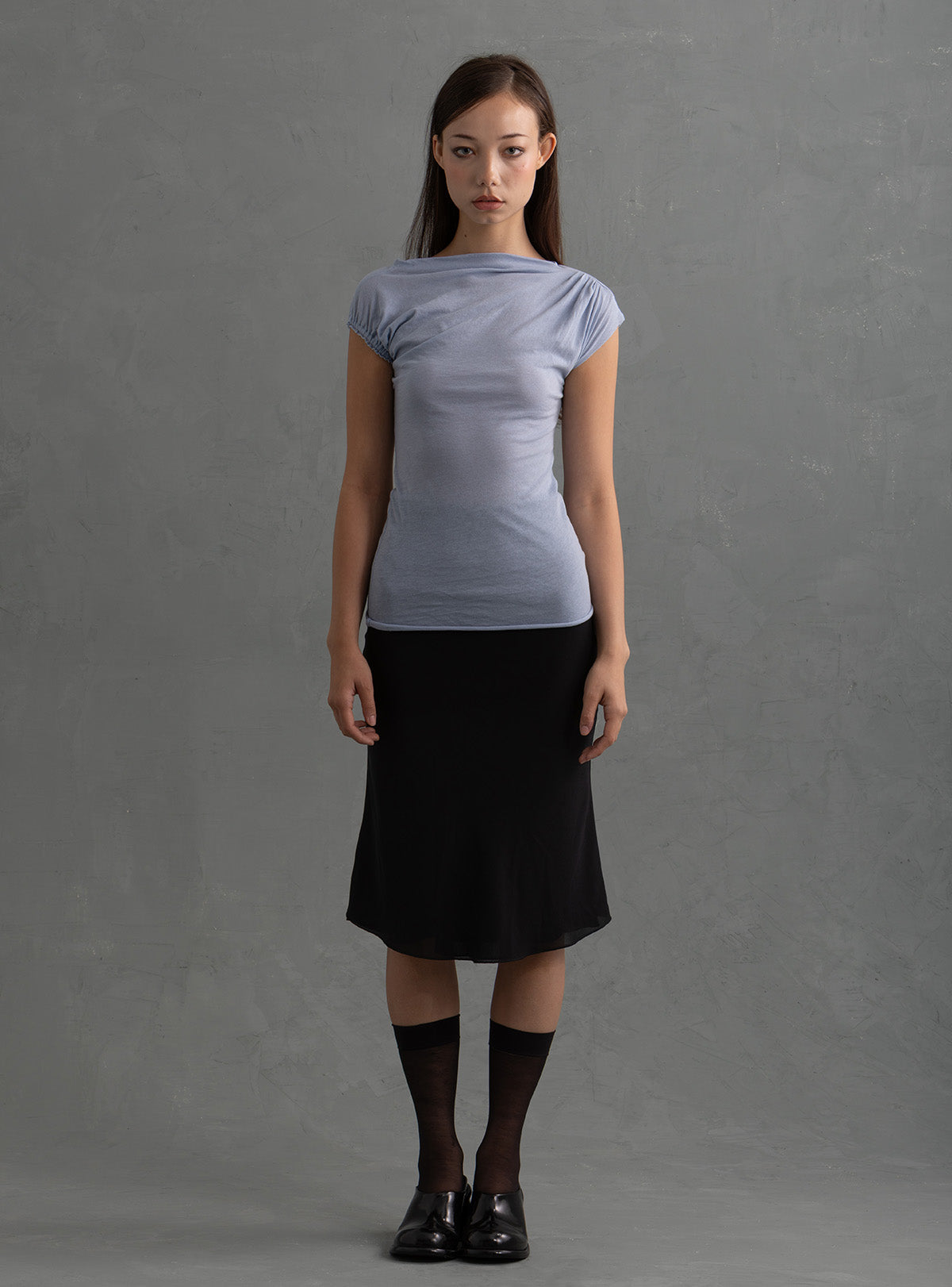 This elevated and simple top is made from an ultra-soft 100% Cotton fabric milled in the USA. It features an elegant cap sleeve on the right arm and a gentle drape across the neckline with subtle ruching on the left shoulder. This top is also offered in white and vintage black.