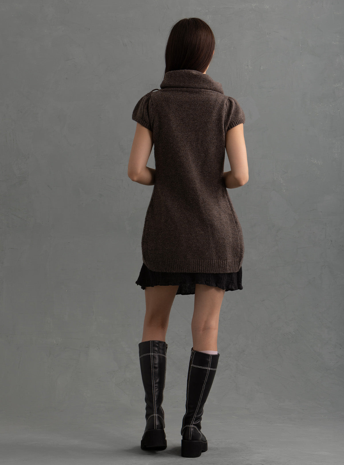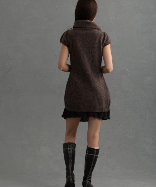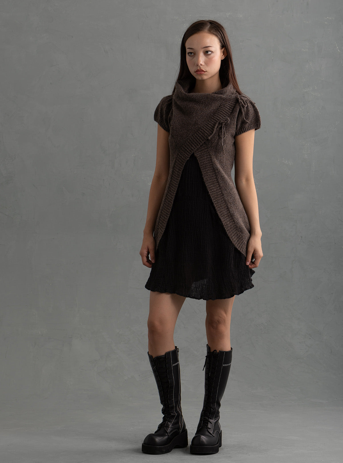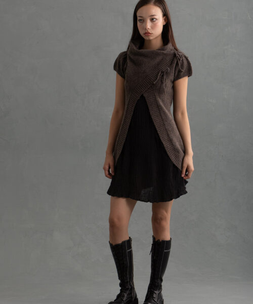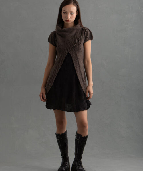Cozy 2000’s inspired wrap-front vest in a soft dark brown knit featuring a sculptural drape neck, asymmetrical ties, semi-puff sleeves and an open front. Ideal for layering fall/winter and transitional outfits.