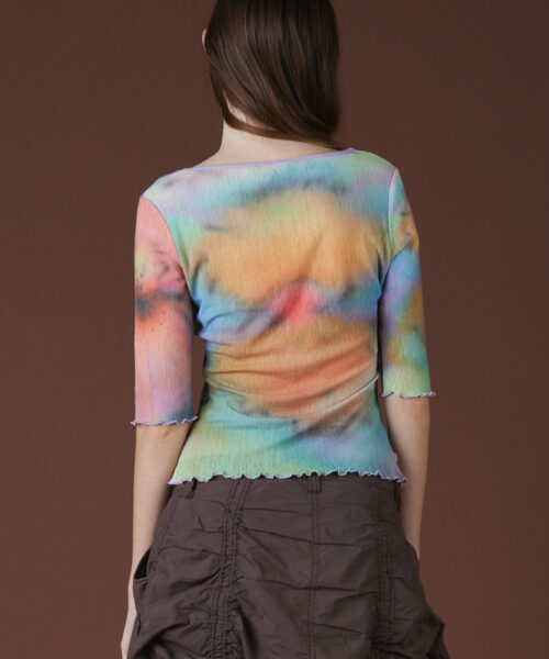 A collaborative piece made with the illustrations of @mf__bae. These works are inspired by the sensuality of nature, embracing slowness, and subtle beauty of transitions. Made with a printed mesh material, 3/4 length sleeve, and Lilac detailing, it’s a perfect transition into your Spring wardrobe.