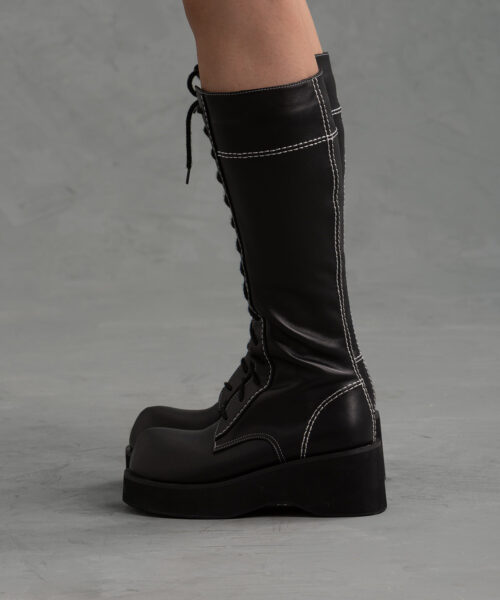 Vintage inspired super comfortable knee-high combat boot with contrast stitching and easy access zip on the inside. Offered in a matte black leather.