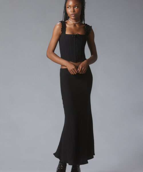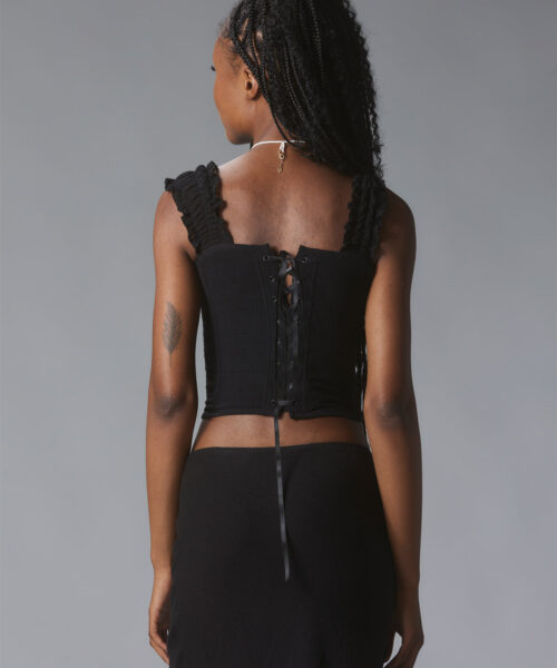 The linen version of the Posey top. Bustier-style top with textured shoulder strap detailing and a bow at the neckline. Model is 5’10” and wearing a size S