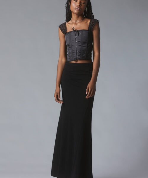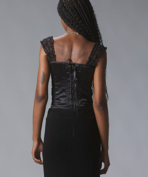 Bustier-style top with textured shoulder strap detailing and a bow at the neckline.