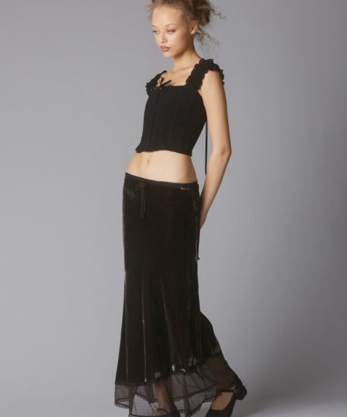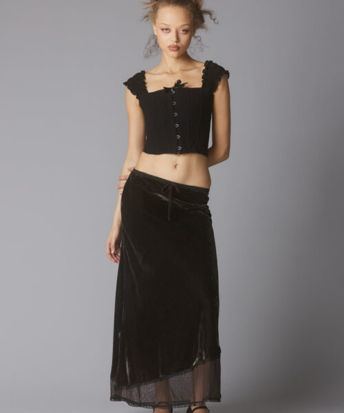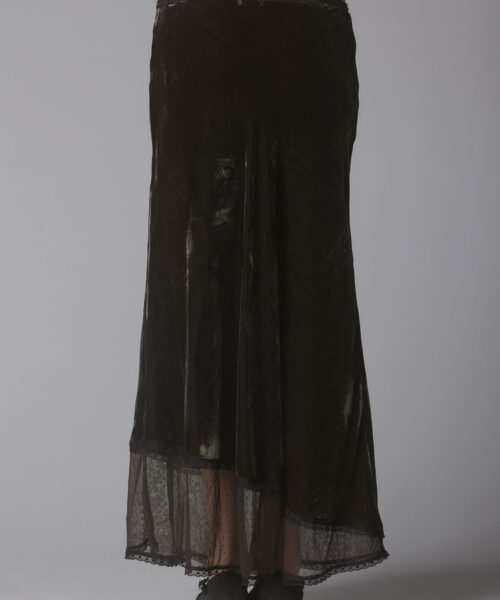 Velvet maxi skirt with asymmetrical lace trim at the bottom. Has a tie closure with lace facing at the waistband