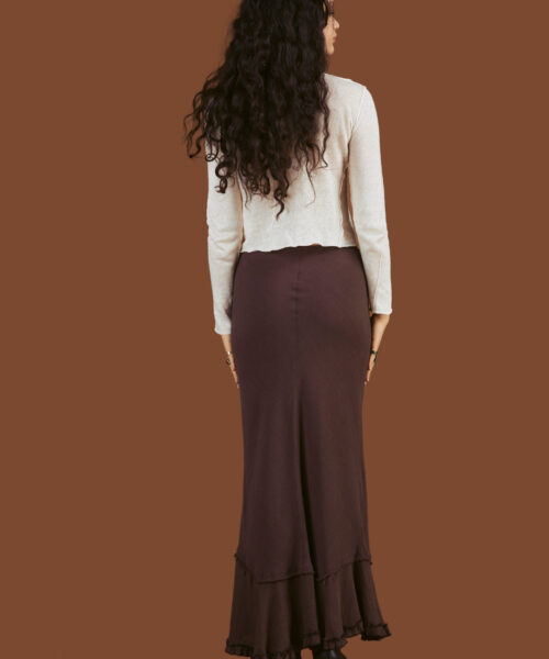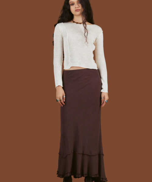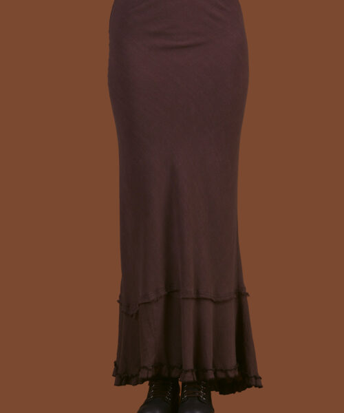 The Rhizome Skirt is a layered maxiskirt with an elastic waist and raw edge detailing. Material is a flowy rayon/linen blend.