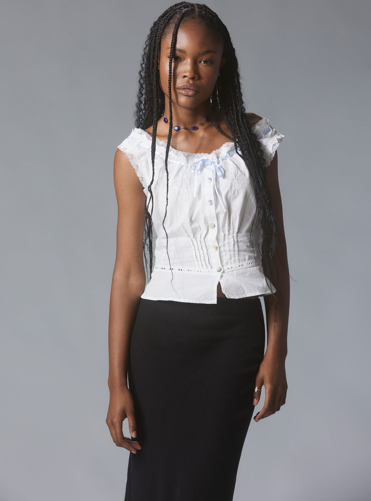 The Rue Top is a button-up blouse featuring ruffle detailing along the neckline, tonal embroidered applique throughout, and contrast satin ribbon at the bust.