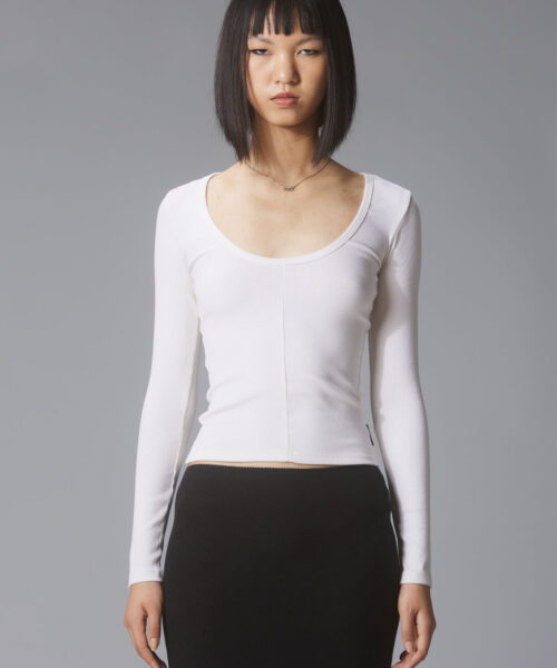 Two-pack of buttery soft scoop neck long-sleeved ribbed tees with center seam, and side flag tag at bottom hem. Designed and made in Los Angeles. Each pack comes with one black and one off-white tee. Fit is true to size.