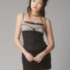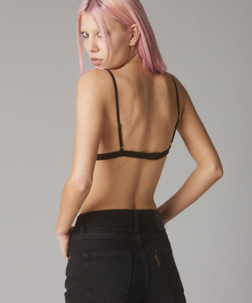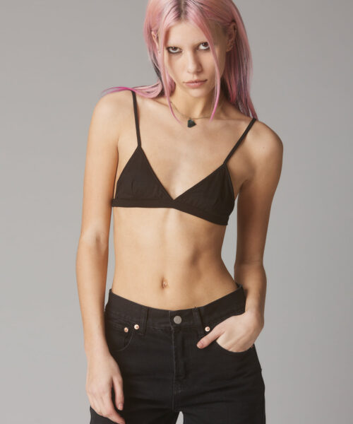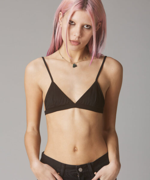 Triangle bra with adjustable shoulder straps and hook/eye closure on back.