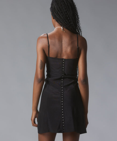 Black mini dress with hook eye closure detailing up the entire back as well as satin ribbon bows at the strap. Has a little bit of stretch for a comfy fit.