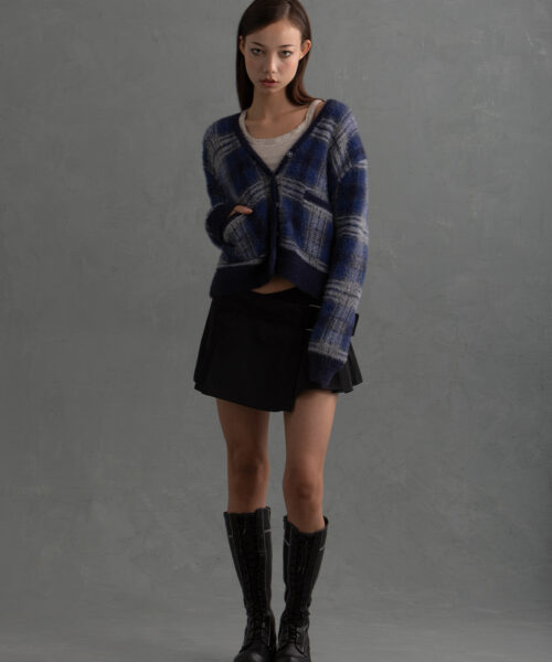 Fuzzy, over-sized, supersoft plaid cardigan with a boxy fit. Features include two front pockets, elongated sleeves and a UNIF flag tag at the bottom of pocket seam.