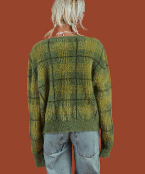 Fuzzy, over-sized, supersoft plaid cardigan with a boxy fit. Features include two front pockets, dropped shoulders, elongated sleeves and a UNIF flag tag at the
