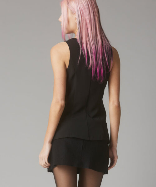 Structured vest style top with dark wooden buttons up the front and at shoulders. Featuring princess seams for a more flattering fit.