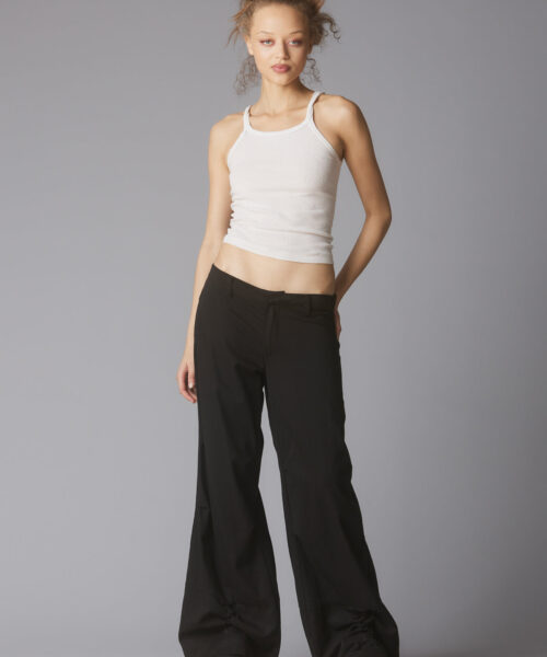 The Vast Pant is a wide-leg, low-rise tech pant with pull-tie ruching detail at the front bottom. Also features back patch pockets beneath the yoke and a zip fly. Take your normal size they are very low-rise and will rest on the low hip.