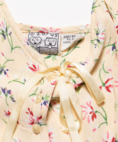 90’s floral print, gauzy fabric, mini dress with satin tie detailing and open button front. Would look perfect with a fuzzy cropped cardigan.