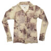 Very cool block printed top featuring appliqued patches and hand bead work. Peaked bottom hem. The front is a double layered synthetic sheer material. The sleeves and back panel are poly rib with stretch. No label.