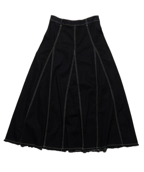 Lightly washed Black denim long skirt. Lots of contrast stitch detail. Frayed hem, custom shank button, zipper fly, and no pockets.