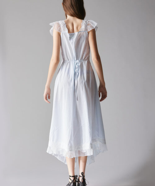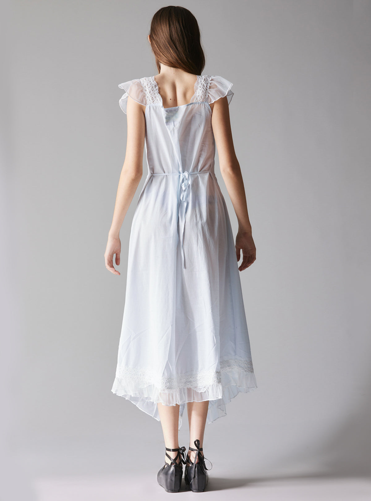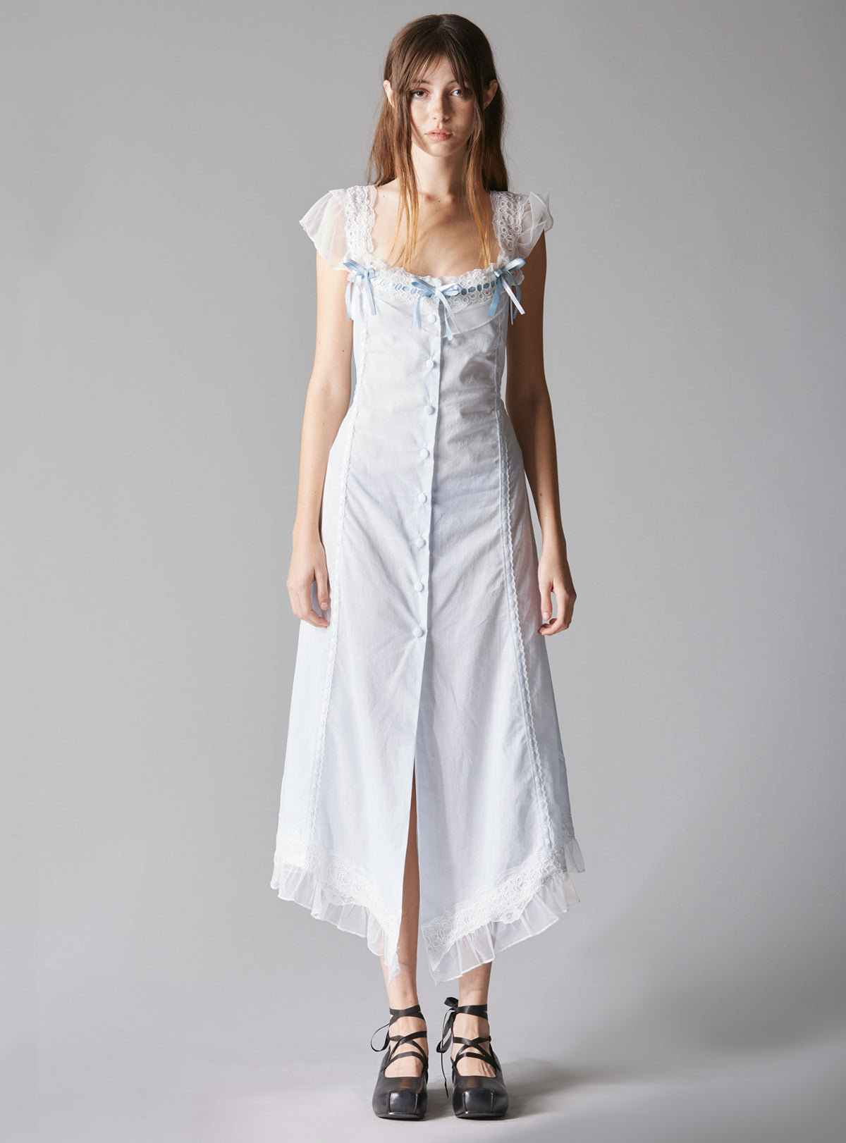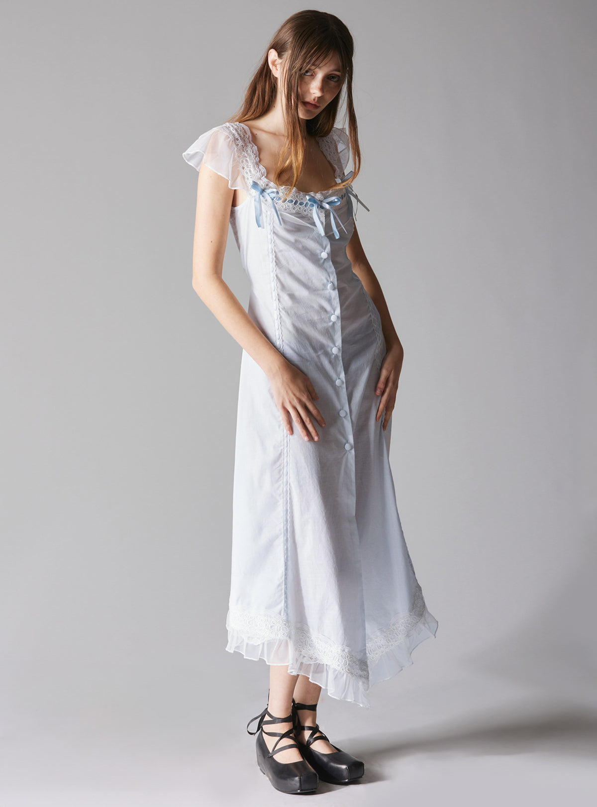 Whimsy fairycore vintage inspired dress with lace ribbon-weave throughout an Ice Blue lightweight cotton fabric. Beautiful details like matching center front cover buttons, three layered blue bows around the neck line, a mesh flounce sleeve, and an asymmetrical hem.