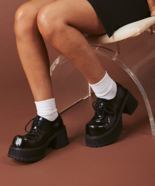 This black platform oxford features a polished leather upper, chunky sole, and lace-up closure. With a bold block heel and rugged rubber outsole, it’s a modern take on the classic oxford, blending style and comfort for a standout look. Fit is true to size.
